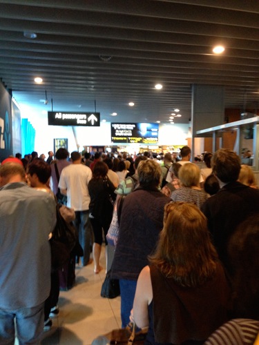 I, along with all other occupants, headed down the escalator to find absolutely no one leaving the terminal. I decided to sit it out at the gate when I saw security peeps heading through the terminal. At that point I realised the complete inanity of my actions and what would be waiting for me airside dawned upon me. Yes a queue to rival all queues. I bolted back to the security area to be herded back into the pre security lanes. I suspect I made the first two or three hundred.